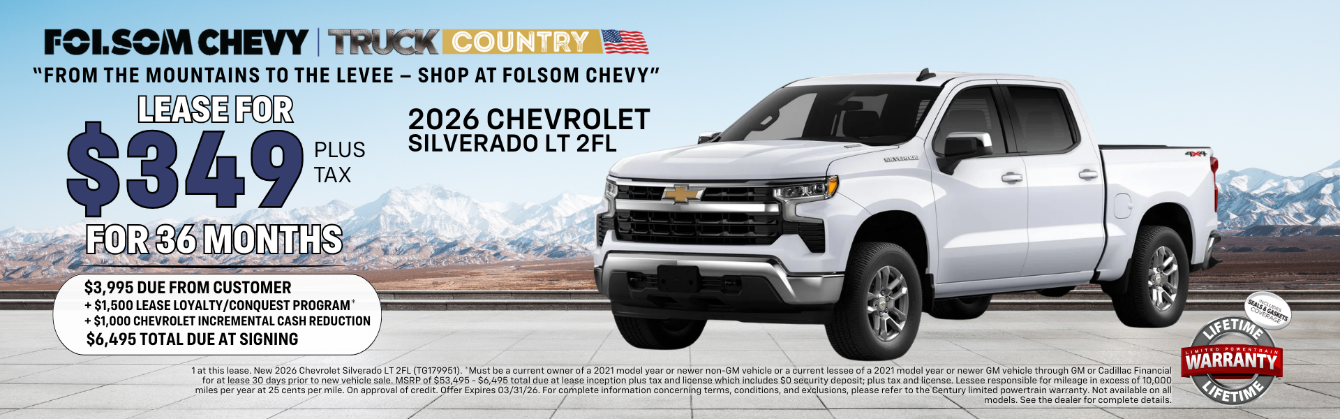 1 at this lease. New 2026 Chevrolet Silverado LT 2FL (TG179951). *Must be a current owner of a 2021 model year or newer non-GM vehicle or a current lessee of a 2021 model year or newer GM vehicle through GM or Cadillac Financial for at least 30 days prior to new vehicle sale. MSRP of $53,890 - $6,495 total due at lease inception plus tax and license which includes $0 security deposit; plus tax and license. Lessee responsible for mileage in excess of 10,000 miles per year at 25 cents per mile. On approval of credit. Offer Expires 03/31/26. For complete information concerning terms, conditions, and exclusions, please refer to the Century limited powertrain warranty. Not available on all models. See the dealer for complete details.